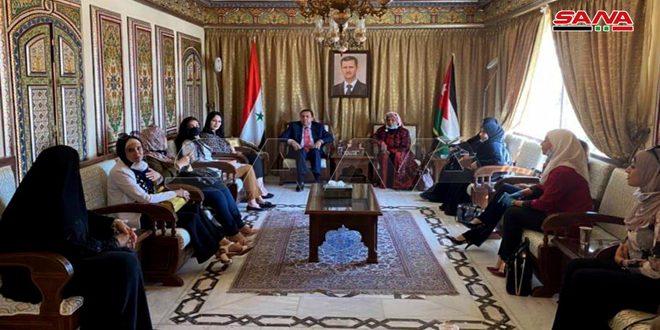 زار وفد نسائي أردني يضم محاميات وإعلاميات ومثقفات ووجوها مجتمعية وناشطات مقر السفارة السورية في عمان للتعبير عن تضامن النساء في الأردن مع الشعب السوري في مواجهة ما يتعرض له من عدوان وإجراءات قسرية أحادية الجانب.