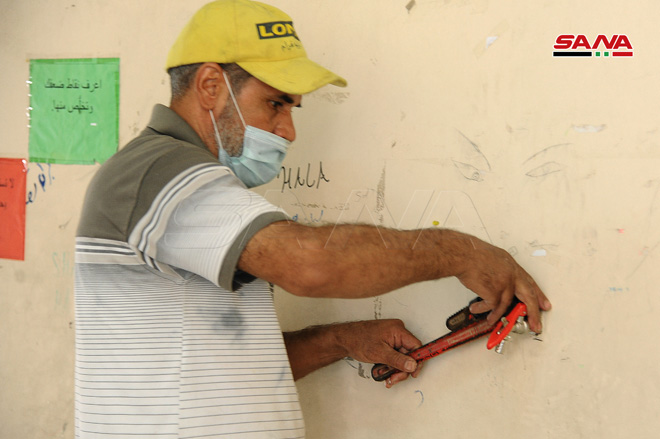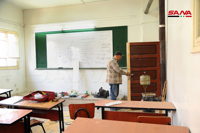 سانا زارت مكان العمل والتقت القائمين والمشرفين عليه حيث أوضحت مديرة الثانوية فاتن خضور في تصريح لمندوبة سانا أن العمل جار على إصلاح وترميم الأبواب والنوافذ والألواح والمرافق الصحية مؤكدة أن المدرسة ستكون جاهزة مع انطلاقة العام الدراسي الجديد.