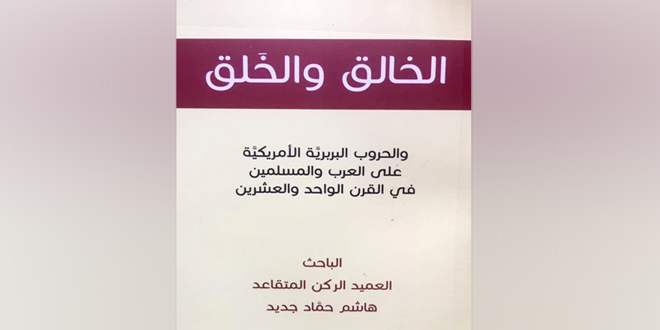 المخططات الأمريكية الساعية إلى التدخل بشؤون الدول العربية بمختلف السبل وفرض أجنداتها عليها خدمة لكيان الاحتلال الصهيوني محاور رئيسية يعالجها كتاب (الخالق والخلق.. والحروب البربرية الأمريكية على العرب والمسلمين في القرن 21) الذي أعده الباحث هاشم حماد جديد.