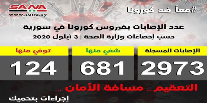 وأشارت الوزارة في بيان تلقت سانا نسخة منه اليوم إلى أن حصيلة الإصابات المسجلة في سورية حتى الآن بلغت 2973 شفيت منها 681 وتوفيت 124 حالة.