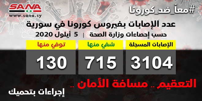 وأشارت الوزارة في بيان تلقت سانا نسخة منه اليوم إلى أن حصيلة الإصابات المسجلة في سورية حتى الآن بلغت 3104 شفيت منها 715 وتوفيت 130 حالة.