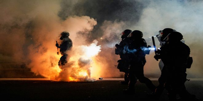 وذكرت وكالة الصحافة الفرنسية أن قوات الشرطة التي ألقت القبض على عشرات المتظاهرين خلال عمليات كر وفر في منطقة سكنية في شرق بورتلاند أعلنت عن إصابة شخص واحد على الأقل فيما كتبت شرطة بورتلاند على تويتر “هذه أعمال شغب.. الشرطة تطلب من الموجودين الابتعاد والتفرق.. المتظاهرون يلقون زجاجات حارقة” لتبرير قمعها واستخدامها الغاز المسيل للدموع لتفريق المحتجين.