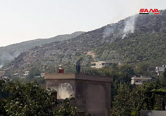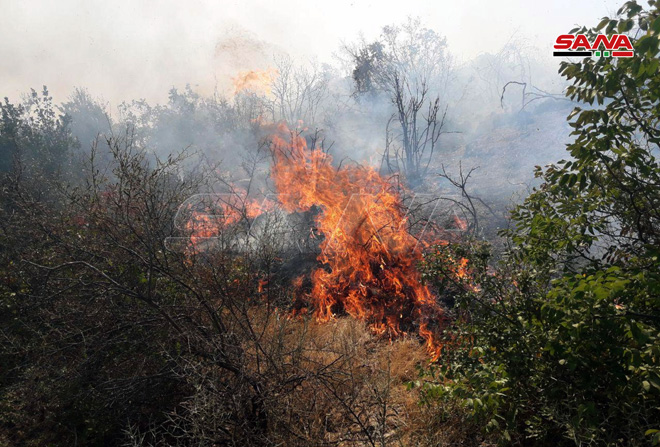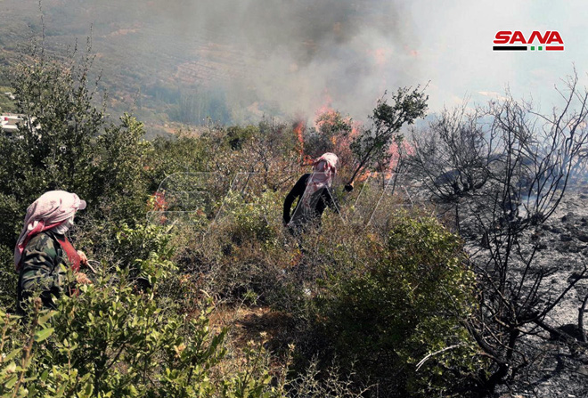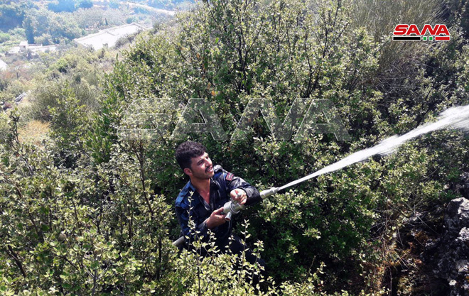 فرق الإطفاء تواصل العمل على تطويق الحريق وإخماده في محيط بلدة حزور جنوب غرب مصياف