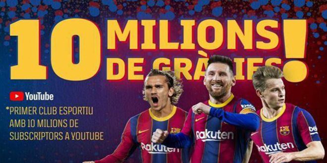 أعلن نادي برشلونة الإسباني اليوم أنه أصبح أول ناد رياضي في العالم يتخطى عدد مشتركيه في موقع يوتيوب الـ10 ملايين متابع في أكبر منصة فيديو على شبكة الإنترنت.