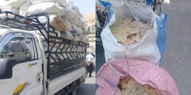 ضبطت عناصر مديرية التجارة الداخلية وحماية المستهلك بريف دمشق ثلاثة أطنان ومئتي كيلوغرام من الخبز التمويني لدى أحد الأشخاص في بلدة منين يقوم بتجميعها للاتجار بها وبيعها كخبز علفي.