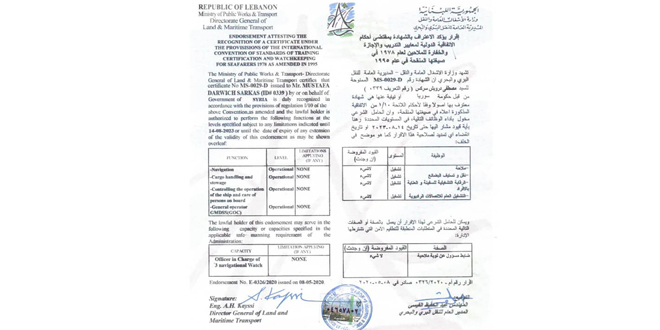 أعلنت وزارة النقل أن المديرية العامة للنقل البري والبحري في الجمهورية اللبنانية أدرجت الشهادات البحرية السورية المعتمدة ضمن اللائحة التي يتم الاعتراف بها من قبلها.
