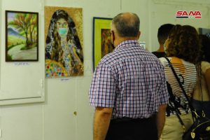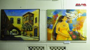 وشاركت الفنانة المكرمة بلوحتين جديدتين في المعرض لأول مرة الأولى جاءت تعبيراً منها عن مشاعر الفرح بتطهير قريتها السقيلبية من الإرهاب والثانية تمثل حريق الغابات وما ترك من أثر سلبي في نفسها.