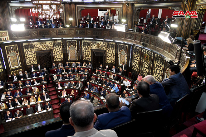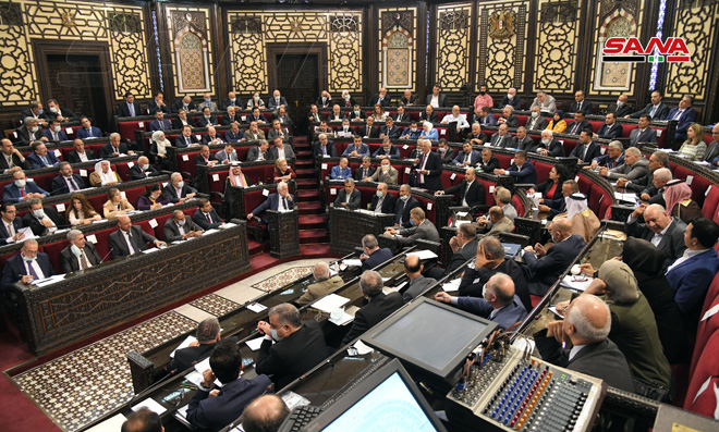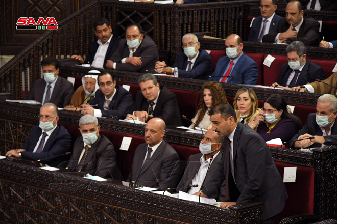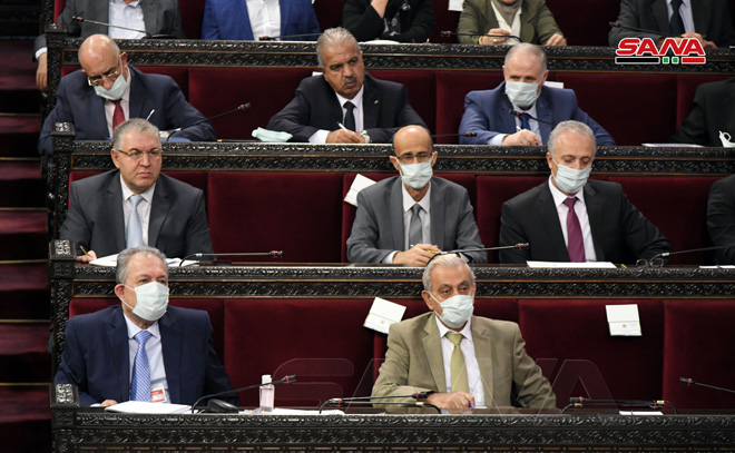 لليوم الثالث على التوالي تابع مجلس الشعب في جلسته الأولى من الدورة العادية الأولى للدور التشريعي الثالث المنعقدة برئاسة حموده صباغ رئيس المجلس مناقشة البيان الوزاري بحضور رئيس مجلس الوزراء المهندس حسين عرنوس وعدد من الوزراء.