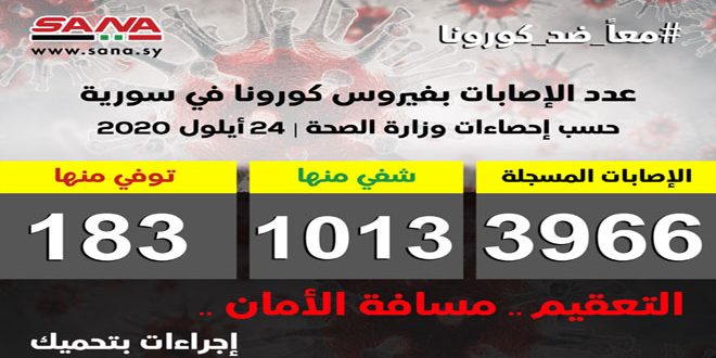 وأشارت الوزارة في بيان تلقت سانا نسخة منه اليوم إلى أن حصيلة الإصابات المسجلة في سورية حتى الآن بلغت 3966 شفيت منها 1013 وتوفيت 183 حالة.