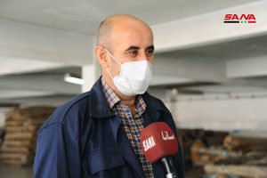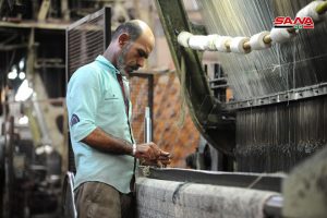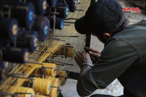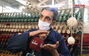 وفي قسم التحضيرات يستلم علي الجوفي رئيس القسم المواد الأولية التي وصلت إلى المعمل عبر شركة الأصواف في حماة ليقوم العمال بتحويل المواد إلى بكرات يمكن وضعها على الآلات وحياكتها.