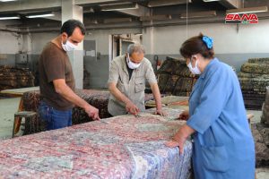 ينتقل المنتج بعدها إلى مرحلة الحبكة و”البيش” حيث يصل الإنتاج إلى القسم على شكل أثواب كبيرة متصلة ببعضها البعض ويقوم القسم بفصلها عن بعضها ووضع الخيوط المتدلية في نهاية السجادة وبذلك تصبح جاهزة وترحل إلى المستودع وصالة البيع في المعمل وفق عامر رضوان الخن رئيس القسم.