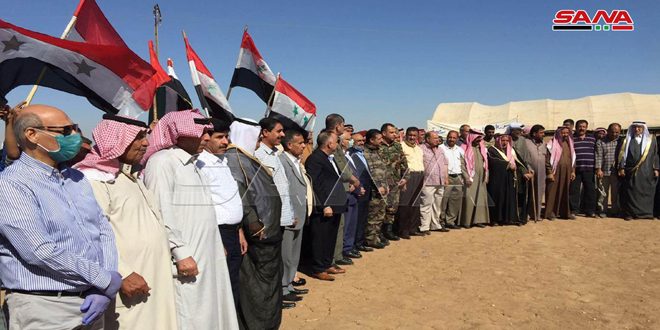 ورفع المشاركون أعلام الوطن ورددوا هتافات تطالب بخروج القوات المحتلة الأمريكية والتركية الموجودة على الأراضي السورية والتي نهبت خيرات السوريين واستباحت أرضهم.