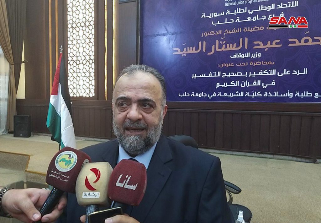 وكان وزير الأوقاف قد التقى طلاب كلية الشريعة بجامعة حلب على مدرج معهد التراث العلمي في محاضرة تحت عنوان “الرد على التكفير بصحيح التفسير في القرآن الكريم” تحدث فيها عن كيفية مواجهة الفكر التكفيري الإرهابي من خلال عمل المؤسسات الدينية لافتا إلى أن الفكر التكفيري عمل على تسييس الدين على يد الأخوان المسلمين والوهابية.
