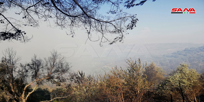 فرق الإطفاء تتعامل مع حريق الفاخورة بريف اللاذقية الشرقي
