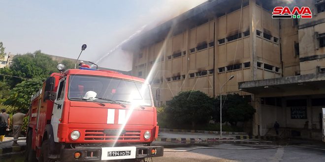 فرق الإطفاء تكافح لإخماد الحريق الذي وصل إلى مبنى مستودعات المؤسسة العامة للتبغ “الريجة” بالقرداحة