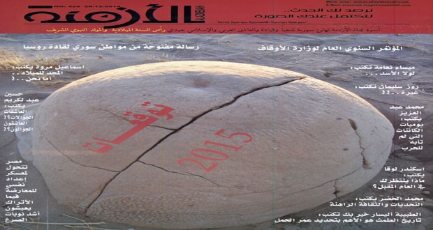 وفي افتتاحية العدد كتب الدكتور نبيل طعمة مقالا بعنوان توقعات 2015 رأى فيه ان حال منطقة الشرق الأوسط يصطلح هذا العام بعد انكسار مشروع ما سمي بالربيع العربي حيث يعود الاخوة الأعداء الى بناء علاقات متفائلة جديدة وتنتهي غربة الاصدقاء عن بعضهم الى حد ما ريثما تتم استعادة الثقة المفقودة.