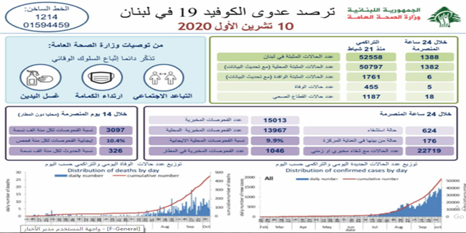 أعلنت وزارة الصحة اللبنانية تسجيل خمس وفيات و1388 إصابة جديدة بفيروس كورونا في لبنان.