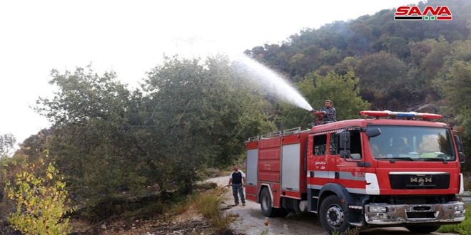 بالصور.. عمليات تبريد مواقع الحرائق التي تمت السيطرة عليها وفتح خطوط النار في جبال منطقة القرداحة وقسطل معاف بريف اللاذقية