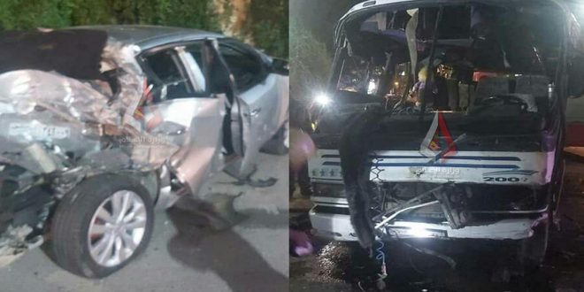 وأشار المصدر إلى أن الحادث تسبب بإصابة 16 شخصاً بينهم ثلاثة أطفال بإصابات خفيفة إلى متوسطة من ركاب الحافلة والسيارة نقلوا إلى مشفى المواساة لتلقي العلاج.