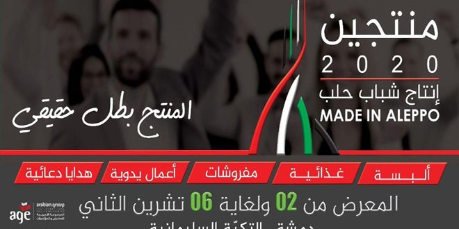 بمشاركة 77 منتجاً من صناعيي حلب في مجال الصناعات الغذائية والمفروشات والألبسة والصناعات اليدوية يقام معرض “منتجين 2020” في التكية السليمانية بدمشق في الفترة ما بين الثاني والسادس من تشرين الثاني المقبل.