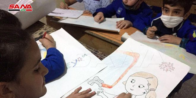 وركزت أعمال الأطفال في المعرض على الجانب الصحي والتوعوي من خلال رسومات تبين طريقة الوقاية من فيروس كورونا إضافة إلى لوحات تناولت أهمية اللغة العربية وحب الأطفال للعلم والمدرسة.