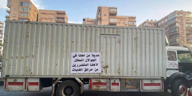المحامية رشا الحلح المشرفة على حملة المساعدات المقدمة من أهلنا في الجولان السوري المحتل بدمشق أوضحت في تصريح لمراسل سانا بالقنيطرة أن المساعدات تعبير عن تضامن أهلنا في الجولان المحتل مع أهلهم في الوطن ولا سيما في المحافظات التي تضررت بفعل الحرائق وتأكيد على القيم الاجتماعية التي تربط أبناء الشعب السوري في جميع الظروف مشيرة إلى أنه تم إيصال القافلة بالتعاون مع الفريق التطوعي في جمعية “ساعد” بدمشق.