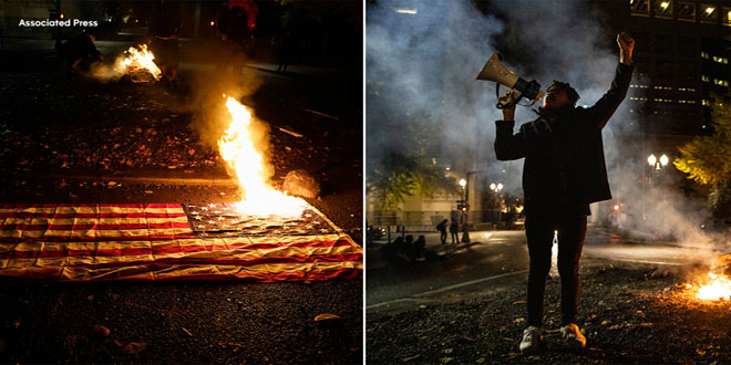 وفي بورتلاند بولاية اوريغون أحرق متظاهرون أعلاما أمريكية وساروا في شوارع المدينة يرددون هتافات احتجاجية ويحملون بنادق هجومية وسط توتر شديد.