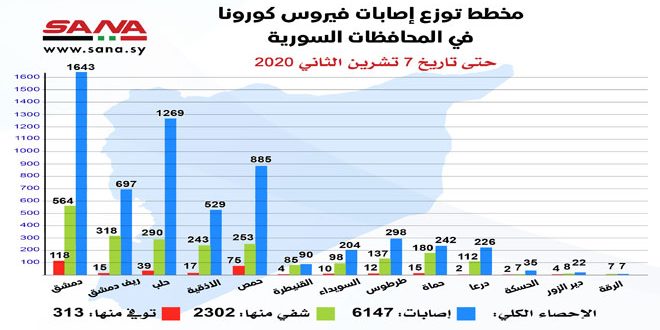 ووفق بيانات وزارة الصحة وصل العدد الإجمالي للإصابات المسجلة في سورية منذ بدء انتشار الفيروس حتى السابع من الشهر الجاري إلى 6147 إصابة شفي منها 2302 حالة وتوفيت 313 حالة مع بقاء 3532 نشطة.