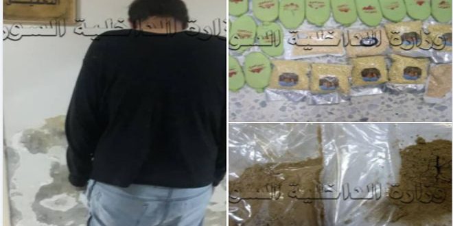 ألقت إدارة مكافحة المخدرات القبض على أحد مروجي المواد المخدرة في إحدى ضواحي مدينة دمشق وبحوزته 7 كيلوغرامات منها.