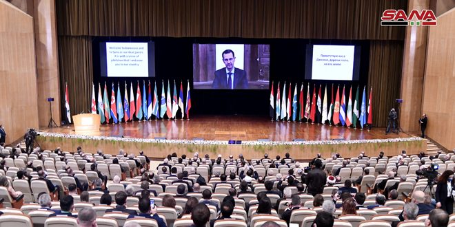 أرحب بكم في دمشق وقد وطئتم أرضها ضيوفاً أعزاء… وأهلا بكم في سورية التي وإن أدمتها سنون الحرب الطويلة وأثخنتها بالجراح قسوة الحصار وإجرام الإرهاب لكنها تأتلق فرحاً بلقاء المحبين بحق والمخلصين بحق.. والحاملين في قلوبهم وعقولهم ووجدانهم قضية الإنسان في كل زمان ومكان.