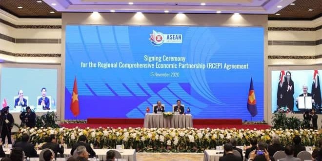 الاتفاق وقعته اليوم رابطة دول جنوب شرق آسيا “أسيان” إضافة إلى الصين واليابان وكوريا الجنوبية واستراليا ونيوزيلندا خلال قمة إقليمية عبر الفيديو في العاصمة الفيتنامية هانوي حيث تمثل هذه الدول الـ 15 نحو30 بالمئة من سكان العالم والناتج المحلي الإجمالي العالمي والتجارة العالمية وجاء التوقيع عليه بعد أكثر من 30 جولة من المفاوضات التي انطلقت في تشرين الثاني عام 2012.