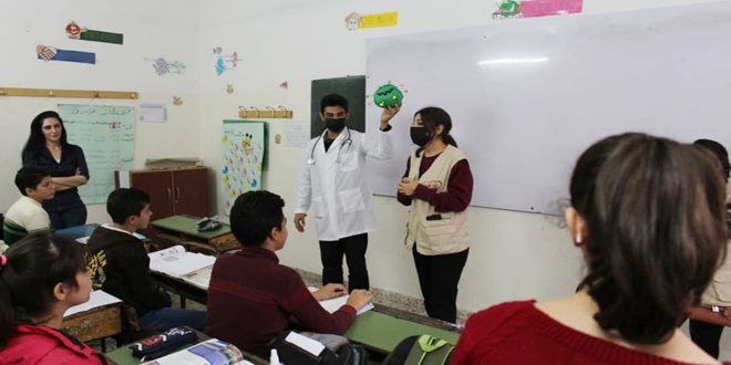 كما تضمنت الفعالية التي أقيمت بالتعاون مع مديريتي الشؤون الاجتماعية والعمل والتربية في حمص وفق اسبر انشطة توعوية حول فيروس كورونا تم خلالها توزيع الكمامات والمعقمات على الطلاب وتعليمهم الطريقة الصحيحة لاستخدامها مبينة أن الفعالية اختتمت بنشاط تفاعلي أقيم في مركز “جيل الأمل” التابع لكنيسة القديس مار مطانيوس بحي باب السباع.