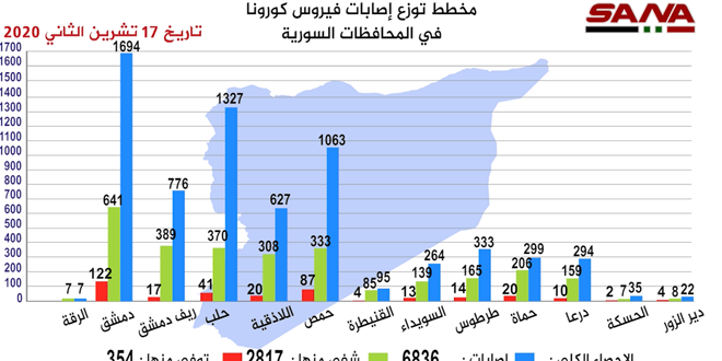 مخطط توزع إصابات كورونا في سورية حتى 17 تشرين الثاني 2020