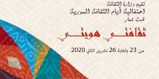 تنطلق عند الساعة السابعة من مساء غد فعاليات احتفالية أيام الثقافة السورية تحت عنوان “ثقافتي هويتي” متضمنة برنامجاً ثقافياً منوعاً أعدته المديريات والمؤسسات التابعة لوزارة الثقافة احتفالاً بذكرى تأسيسها الـ 62 على مستوى دمشق والمحافظات.