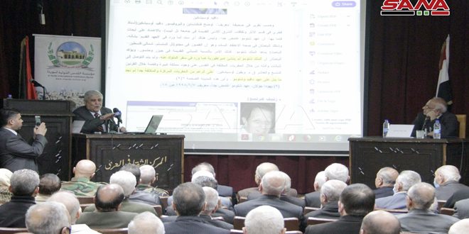 نظمت مؤسسة القدس الدولية-سورية بالتعاون مع اللجنة الشعبية العربية السورية لدعم الشعب الفلسطيني ومقاومة المشروع الصهيوني ومع فصائل المقاومة الفلسطينية اليوم محاضرة بعنوان “سقوط الرواية التناخية حول أرض إسرائيل التاريخية” وذلك في ثقافي أبو رمانة بدمشق.