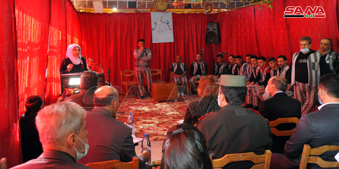 وزيرة الثقافة الدكتورة لبانة مشوح اعتبرت أن الفعالية بمكوناتها تشكل حالة خروج عن الإطار المعتاد لأنشطة الوزارة وتؤكد ما يحظى به النزلاء من معاملة إنسانية تحترم ما لديهم من قدرات ومواهب معربة عن أملها بتعزيز التعاون بين وزارتي الثقافة والداخلية لإعادة دمج هذه الشريحة في المجتمع ليحملوا بيدهم مهنا معطاءة تخدم التراث.