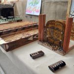 النزيل محمود قرقور شارك بأعمال خشبية صنعها خلال عمله بورشة النجارة لشمعدانات ومشاجب ثياب وجذوع أشجار بأشكال فنية مبيناً أنه استفاد من عمله كنجار وما تلقاه من مساعدات ودعم من إدارة السجن لصناعة منحوتات وتحف من الخشب.