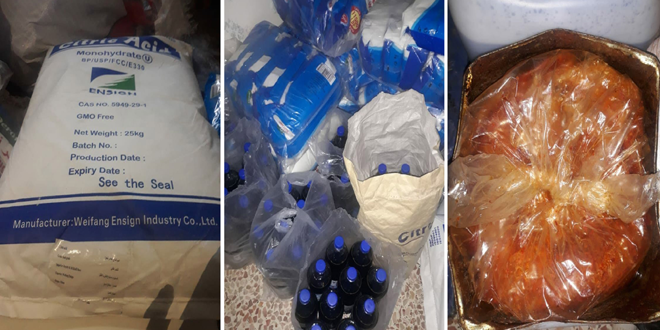 وبين أنه تمت مصادرة المواد الأولية ضمن الورشة التي تستخدم لصناعة المادة والتي تشمل سكر كمية 6 طرود وزن الطرد 25كغ ومكثف صناعي غذائي كمية 25كغ وحمض ليمون كمية 75كغ ومادة دبس رمان مصنع كمية 5 غالونات وزن الغالون 20كغ إضافة إلى 50 عبوة بلاستيكية حجم العبوة 5ر1ليتر وبرميل ستاليس ستيل لخلط المواد الداخلة بالتصنيع واسطوانة غاز صناعي عدد 1 .