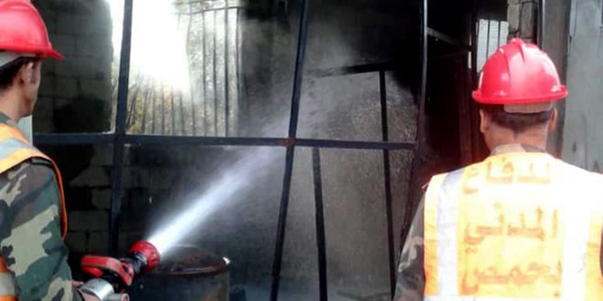 أخمد عناصر الدفاع المدني اليوم حريقا نشب بمستودع يحتوي على أسطوانات غاز ومحروقات في بلدة زيتا بمنطقة القصير بريف حمص الجنوبي الغربي.