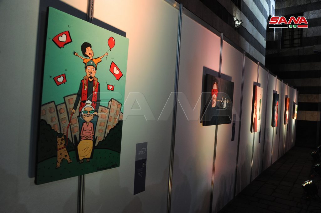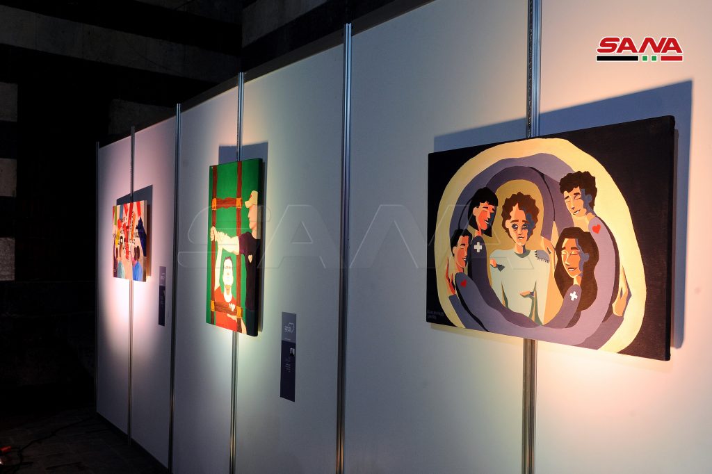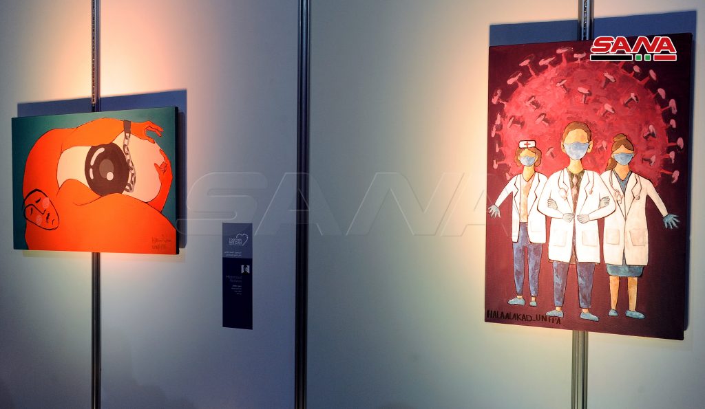 ومن معرض اللوحات بينت المشاركة حلا العقاد أنها اختارت موضوع لوحتها عن فيروس كورونا استنادا للواقع الذي نعيش به ولتسليط الضوء على جهود الكوادر الصحية لافتة إلى أهمية المشاركة بفعاليات تطوعية خاصة بفئة الشباب للتعريف بهم وبأعمالهم بمختلف المجالات.