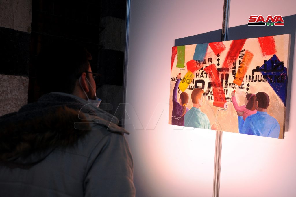 لوحة المشاركة جودي شخاشيرو تناولت العنف الاجتماعي ضد المرأة حيث ذكرت لـ سانا أن لوحتها تعبر عن تحكم المجتمع بالمرأة مهما كان مستواها الاجتماعي والفكري مشيرة إلى دور الفن التطوعي بإيصال الفكرة لأكبر عدد من فئات المجتمع فيما تناول حمود رضوان في لوحته موضوع العنف القائم على النوع الاجتماعي باختلاف الجنس “ذكر أو انثى” معتبرا أن المعرض يتيح لهم الفرصة للتعريف بمهاراتهم ويفتح لهم المجال للدخول في سوق العمل.