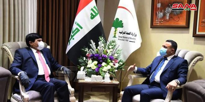 وجاء في بيان لوزارة الصحة العراقية تلقت مراسلة سانا في بغداد نسخة منه أن “الجانبين بحثا عددا من المواضيع التي تصب في مواجهة جائحة كورونا وسبل تعزيز التعاون الصحي بين البلدين والتبادل العلمي المشترك”.