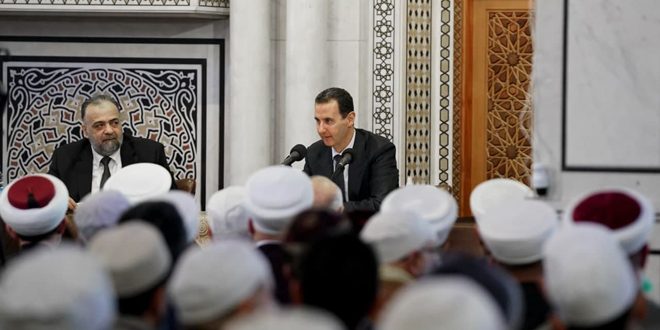 شارك السيد الرئيس بشار الأسد اليوم في الاجتماع الدوري الموسع الذي تعقده وزارة الأوقاف للسادة العلماء والعالمات وذلك في جامع العثمان بدمشق.