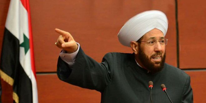 وقال المفتي حسون: أطل عليكم من أرض باركتها السماء وقدستها أقدام الأنبياء.. أحدثكم من أرض حاولوا منذ عشر سنوات تدمير جيشها وإذلال شعبها لكن سورية صمدت وانتصرت على المتآمرين وظلت حاضنة المقاومة وداعمتها الصادقة وستبقى مع المقاومة في نفس الخندق ولآخر نفس.