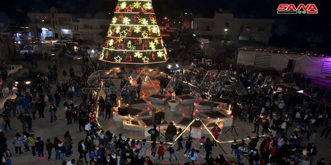الخوري فيليبيوس السعد لفت إلى أن إنارة شجرة ميلاد كبيرة في البلدة تبعث في نفوس الكبار والصغار الفرحة والبهجة للتعبير عن السعادة والفخر بالوطن رغم كل الالام والمآسي والحصار والتحديات التي تواجهه مؤكداً أن سورية ستبقى مثل شجرة الميلاد دائمة الخضرة ويسطع نورها في كل الأوقات والظروف بوحدة شعبها والتفافه حول قيادته وجيشه.
