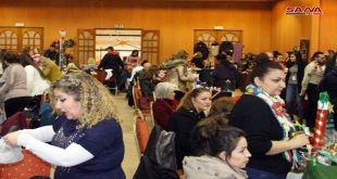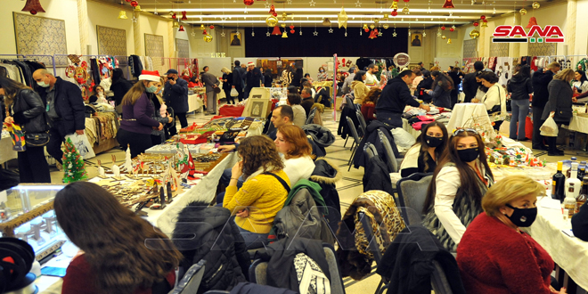 خمسون مشاركاً قدموا منتجات من صنع أيديهم تنوعت بين أشغال يدوية وصوفية وتحف خشبية وأيقونات ولوازم زينة للأشجار من مختلف الأشكال والألوان وألبسة وحلويات وأغذية متنوعة في السوق الخيري الميلادي الذي تقيمه أخوية سيدات الصليب الخيرية في كنيسة الصليب المقدس بدمشق.