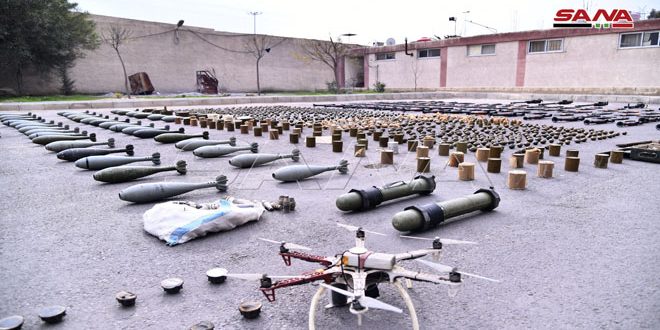 وذكر مصدر في الجهات المختصة في تصريح لمراسل سانا أنه من خلال المتابعة الأمنية الدقيقة وبالتعاون مع وحدات الجيش العربي السوري في المنطقة الجنوبية تم العثور على كمية من الأسلحة والذخائر المتوسطة والثقيلة والخفيفة من مخلفات التنظيمات الإرهابية بعضها إسرائيلي الصنع إضافة إلى طائرة استطلاع.