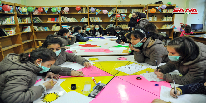 أقام المركز الثقافي العربي بالمزة بالتعاون مع جمعية بيت الخط العربي والفنون نشاطاً في الخط العربي اليوم لعشرين طالبة من مدارس بنات الشهداء تتراوح اعمارهن بين 8 و 12 سنة ضمن فعاليات أيام اللغة العربية تحت عنوان “لغتي هويتي”.