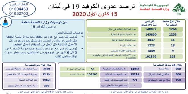 أعلنت وزارة الصحة اللبنانية تسجيل 13 وفاة و1264 إصابة جديدة بفيروس كورونا في لبنان خلال الساعات الـ 24 الماضية.