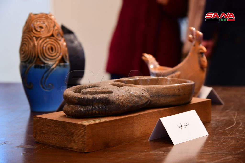 الفنانة لينا قابسي بينت أنها شاركت بعمل من الخزف اسمته إيحاء لأنه جاء على شكل قطعة مكسورة محاولة عبره تقديم رسالة بأنه يمكننا إعادة البناء من الأشياء المحطمة وبأننا سنعيد بناء سورية رغم ما لحق بها من دمار لافتة إلى جماليات العمل بالخزف وتكويناته.